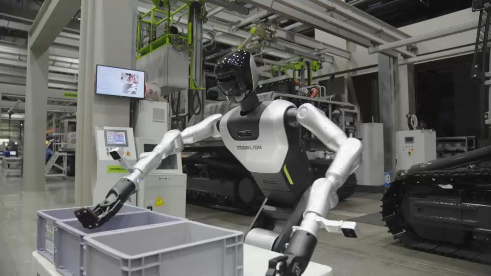 ▲中聯(lián)重科自主研發(fā)的人形機(jī)器人在裝配產(chǎn)線作業(yè)