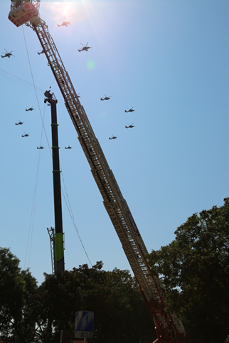 QY80架設的天鷹(左)與60米云梯消防車(右)在大閱兵現(xiàn)場