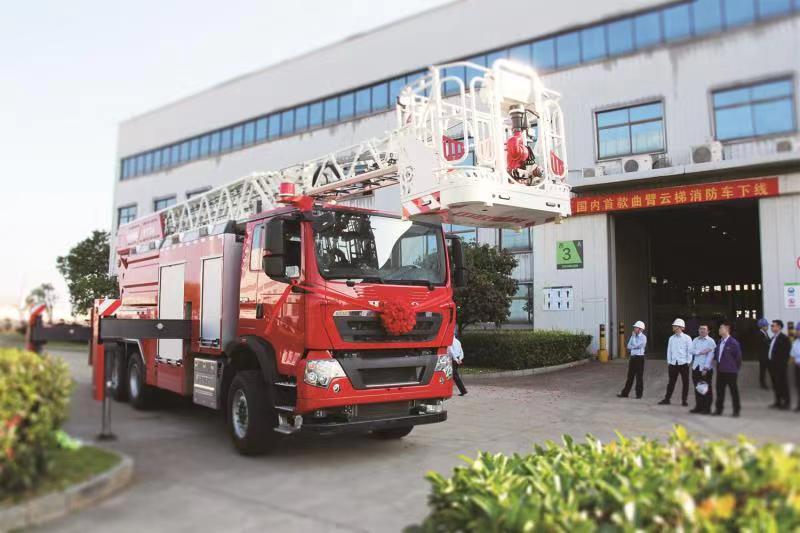 △中聯(lián)重科下線國內(nèi)首款曲臂云梯消防車