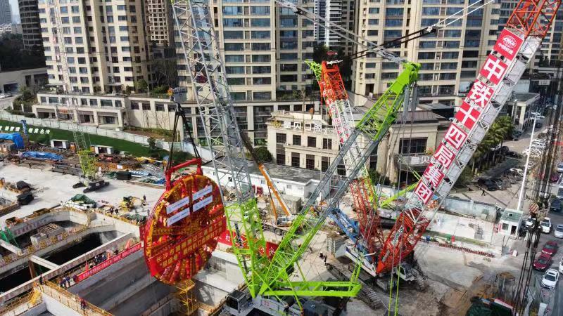 近日,在湖南長沙湘雅路過江通道施工現(xiàn)場,中聯(lián)重科兩臺大型履帶起重機順利地將重約500噸的盾構(gòu)機刀盤吊裝至盾構(gòu)始發(fā)井中,圓滿地完成了盾構(gòu)機安裝中難度**高的一項工序。吊裝過程中,翻身、直立、下井,一系列動作行云流水,中聯(lián)重科履帶起重機精準、平穩(wěn)、高效的作業(yè)贏得了廣泛稱贊。