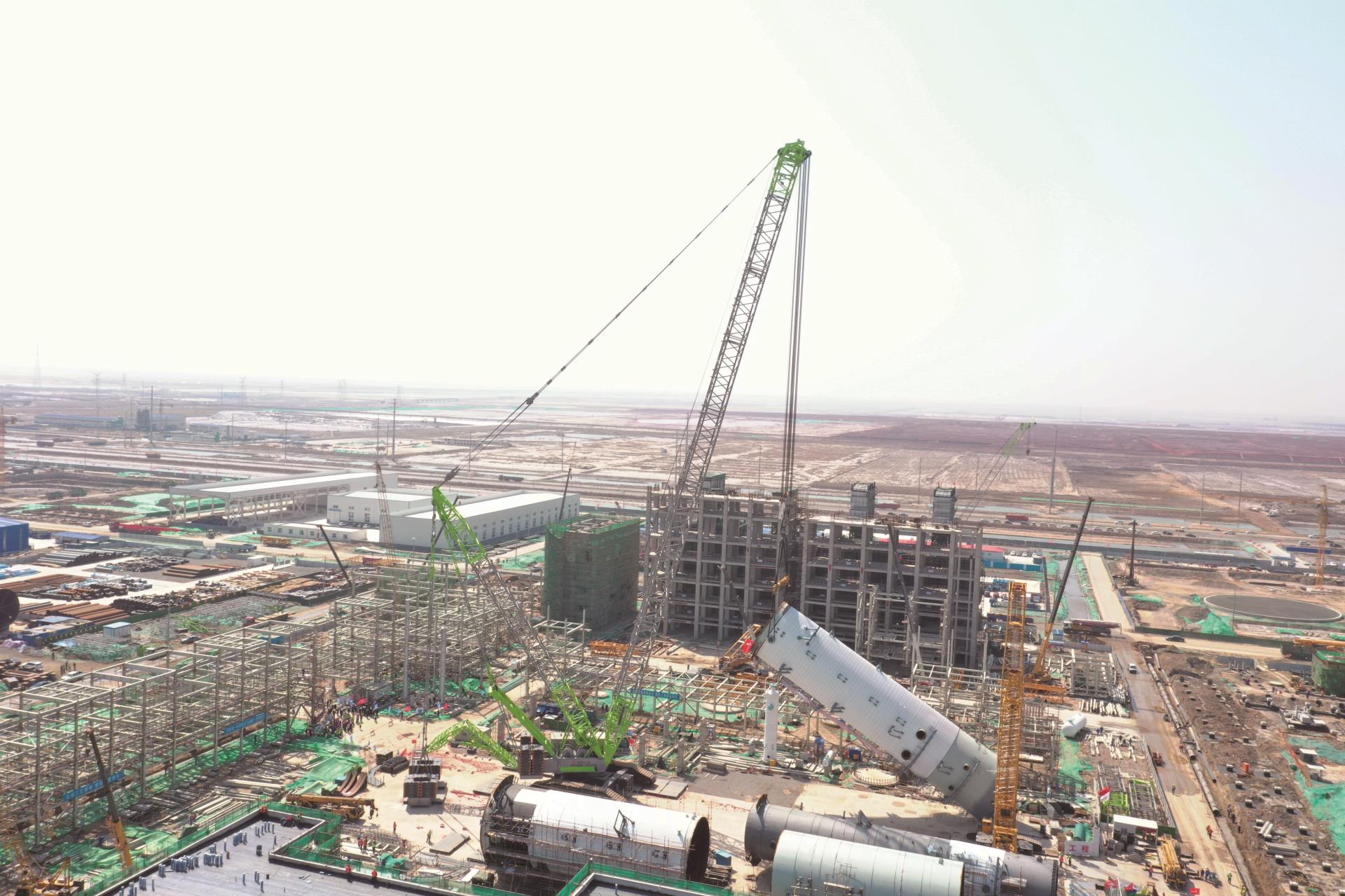 其中,丙烯丙烷分離塔是丙烷產(chǎn)業(yè)鏈項目的核心設(shè)備之一,用于分離丙烯與丙烷。該項目中,丙烯丙烷分離塔重達(dá)770噸,相當(dāng)于500多臺小汽車的重量,吊裝難度可想而知。為確保吊裝一次性成功,項目決定使用吊裝經(jīng)驗豐富的中聯(lián)重科設(shè)備作業(yè)。