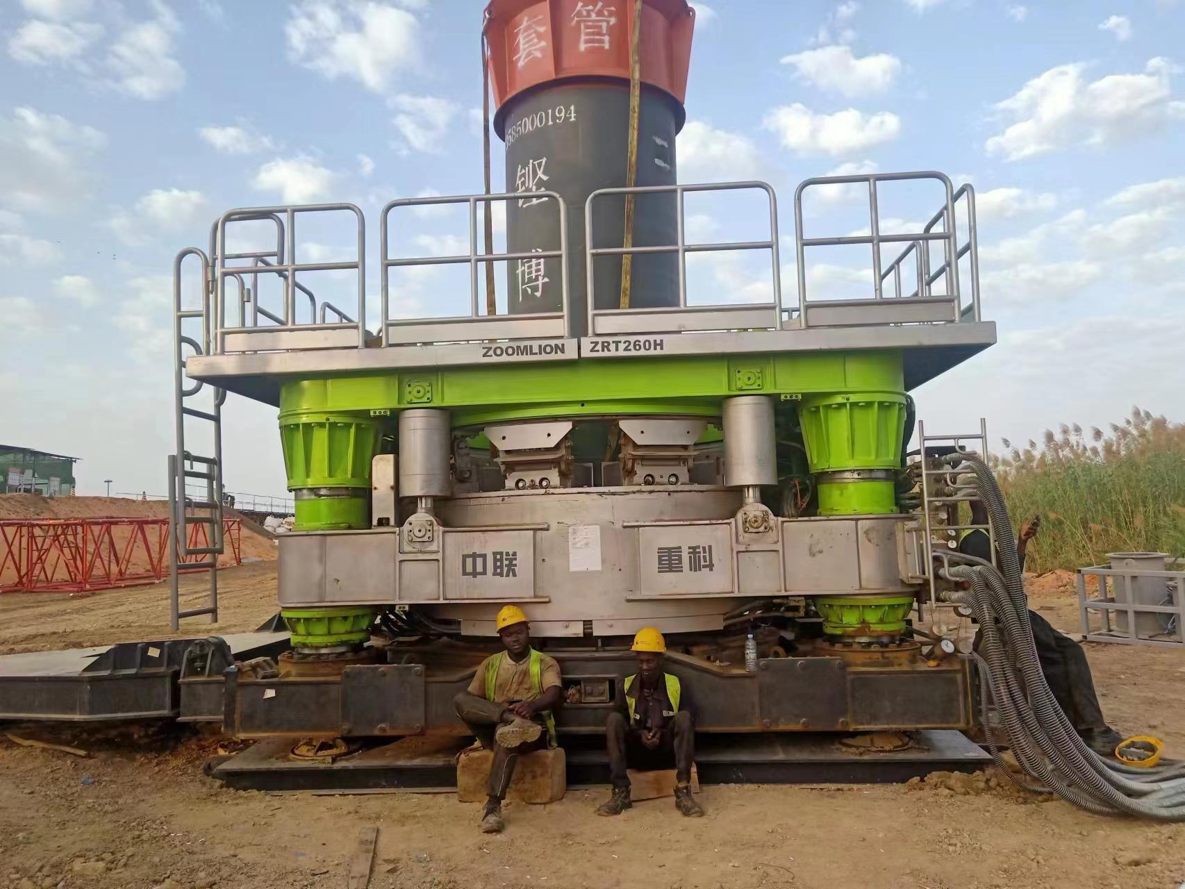 自設(shè)備今年2月進(jìn)場(chǎng)以來,中聯(lián)重科服務(wù)團(tuán)隊(duì)迅速完成了對(duì)當(dāng)?shù)厥┕と藛T的操作培訓(xùn),確保非洲工人能熟練使用全回轉(zhuǎn)鉆機(jī)?!胺侵尥菩械臍W標(biāo)禁止使用化學(xué)泥漿,全護(hù)筒工藝在這里用的很多,這次使用的全回轉(zhuǎn)鉆機(jī)ZRT260H,應(yīng)客戶要求打了根實(shí)驗(yàn)樁,下了55米護(hù)筒,樁深52米,由履帶吊快放取土成孔。客戶評(píng)價(jià)機(jī)器有勁,施工穩(wěn)定,護(hù)筒下的深,完全符合他們的預(yù)期?!敝新?lián)重科非洲駐點(diǎn)服務(wù)工程師佟兵介紹說。