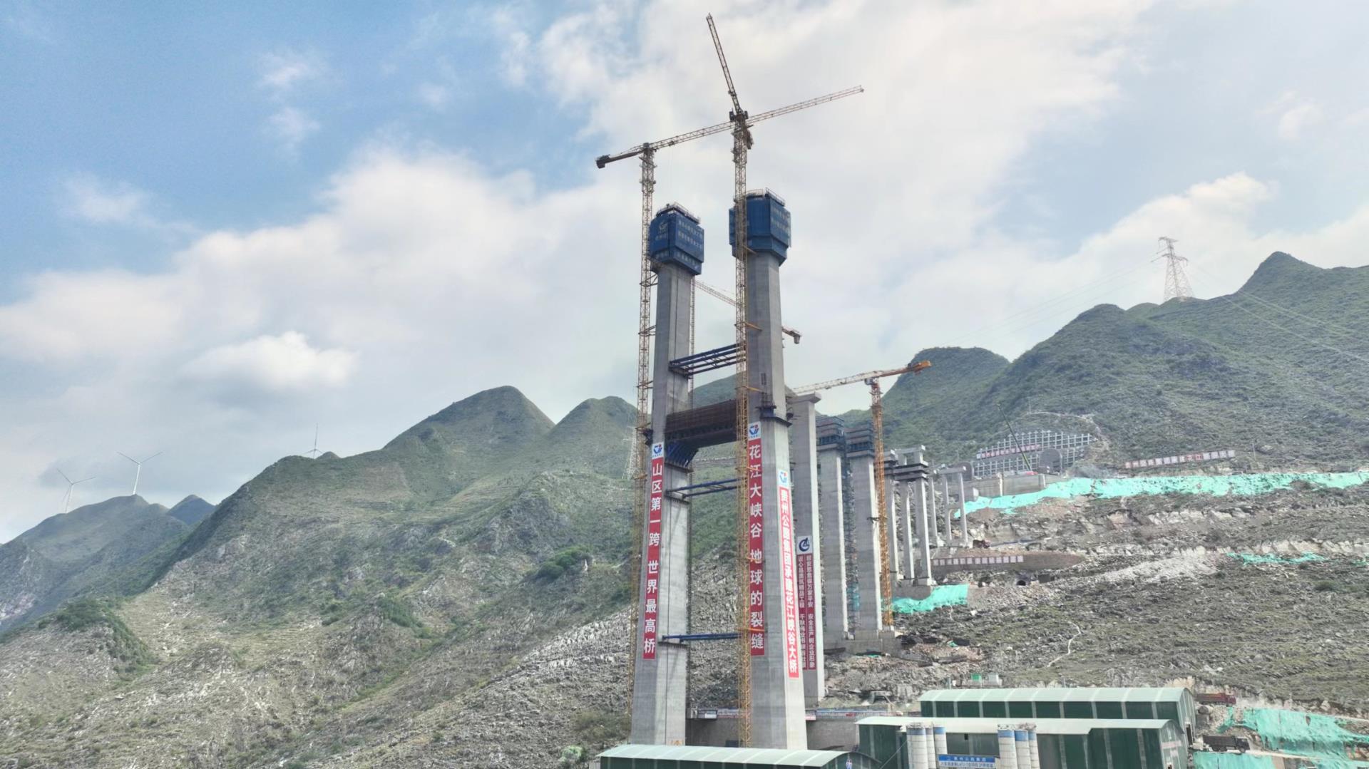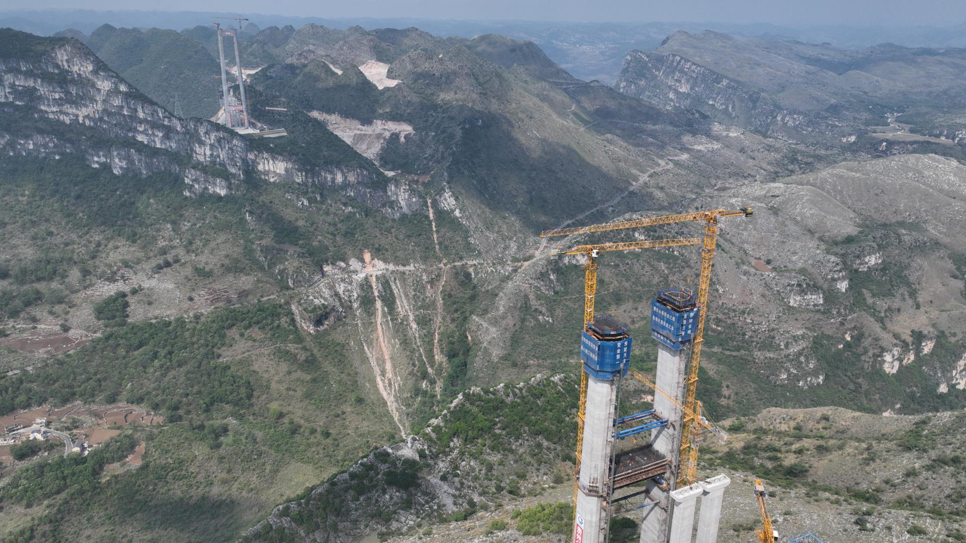 目前,2臺WA7527-20KB平頭塔式起重機(jī)已安裝到280米高度,在5號主塔與6號主塔隔峽相望,拔地而起的高柱聳立于懸崖峭壁,橋下的北盤江宛如藍(lán)色絲帶靜臥于大峽谷的懷抱中。