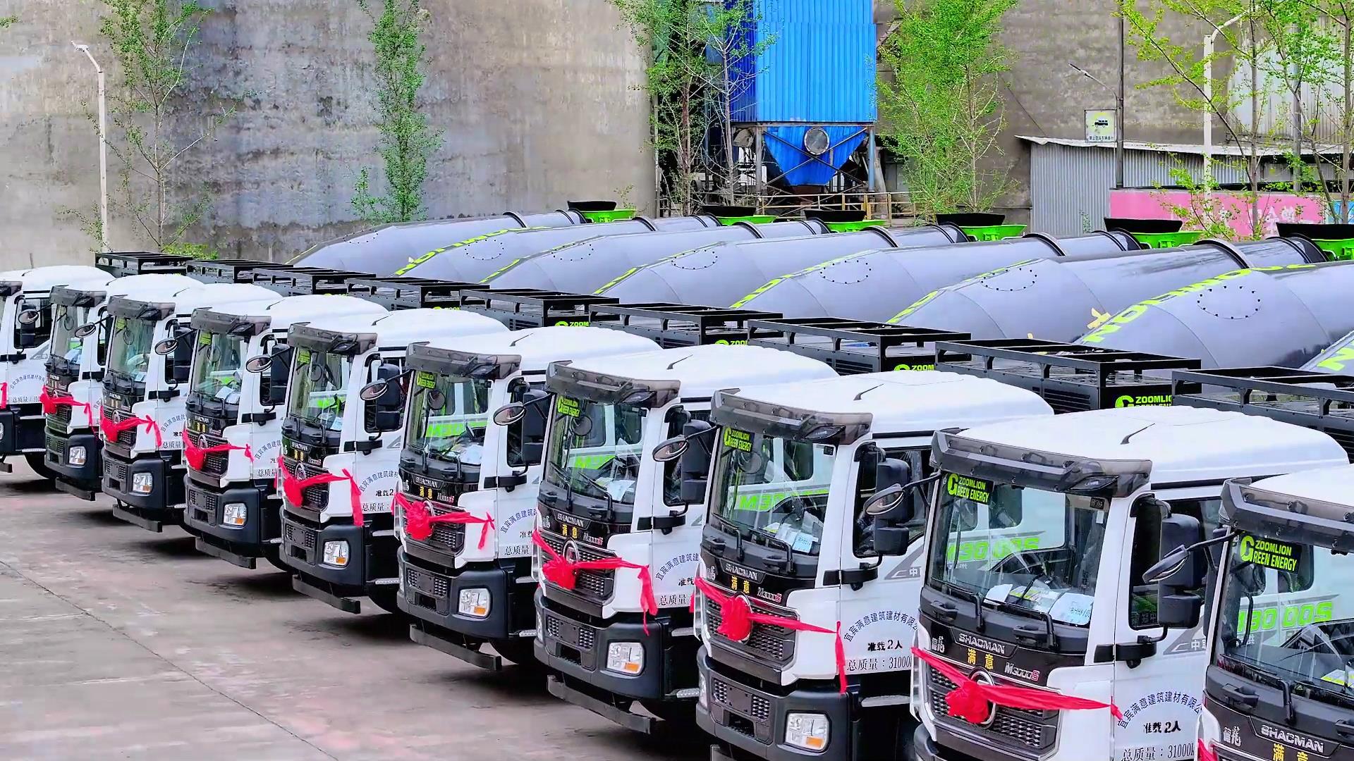 ▲中聯(lián)重科“凌冠”系列新能源攪拌車交付現(xiàn)場