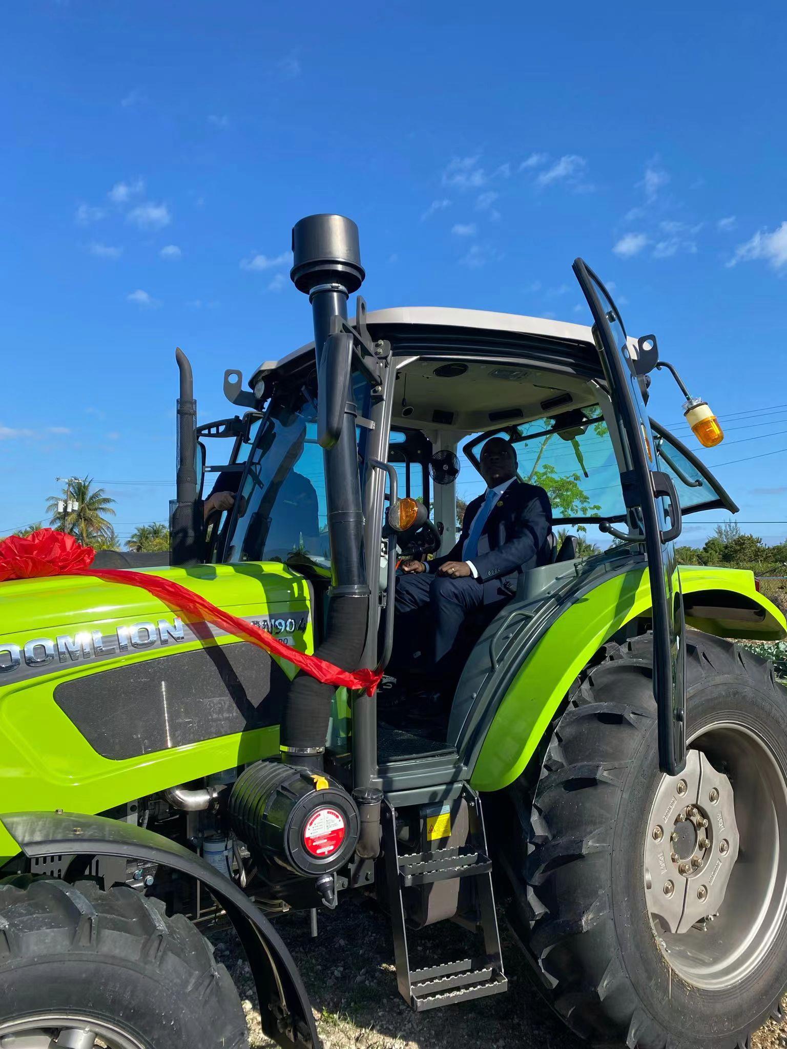 ▲巴哈馬農(nóng)業(yè)和海洋資源部長喬莫·坎貝爾試駕中聯(lián)重科拖拉機(jī)
