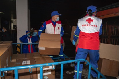 △中聯(lián)重科采購的疫情防護物資運抵長沙后立即交接給湖南省紅十字會